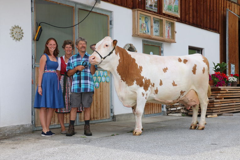 Ein Versteigerungstag ist ein Urlaubstag für ihn. Sepp ist ein treuer Stammgast in Maishofen und er kann am Donnerstagabend einen detaillierten Marktbericht abgeben. Am Hof hat er sich über jahrelange Zuchtarbeit eine bewundernswerte Herde aufgebaut und durfte sich deshalb bei den Versteigerungen öfters über Spitzenpreise freuen. „Die schönsten Kühe wurden selbstverständlich immer wieder auf Rinderschauen in ganz Österreich präsentiert, wir Kinder haben dann auch mit Kälbern und Kalbinnen bei Jungzüchter-Veranstaltungen teilnehmen dürfen und wurden immer bestens unterstützt! Über diese Erfolge war Papa immer besonders stolz und das motivierte ihn, immer aktiv in der Zucht zu arbeiten.“ Die Landwirtschaft wurde seinen Kindern immer positiv vermittelt, so mussten sie natürlich alle von klein auf daheim fleißig mithelfen, das haben sie aber immer mit viel Freude getan. „Besonders mein Bruder Hannes und ich haben uns in Sachen Rinderzucht sehr stark eingebracht.“ Hannes war Obmann der Fleckviehjungzüchter und jetzt ist er im Vorstand beim Maschinenring, bei der Molkerei und Weggenossenschaft und setzt sich aktiv für die Landwirte ein. Verena war ebenfalls fast zehn Jahre im Vorstand der Salzburger Fleckviehjungzüchter, davon auch vier Jahre als Obfrau.