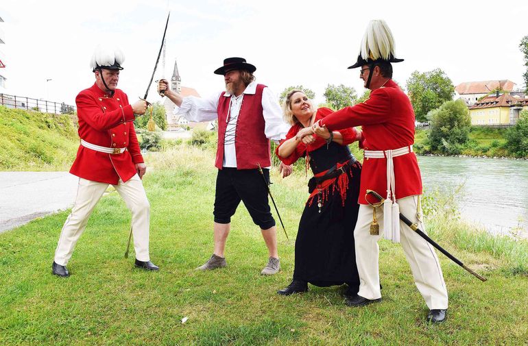 Es gibt sie noch immer, die Flusspiraten an der Salzach. Sie plündern Salztransporte, feiern ein üppiges Hochzeitsgelage am Flussufer, überfallen ehrbare Schiffersleute und treiben auch sonst ihr Unwesen. Doch die Oberndorfer Schifferschützen sind ihnen auf den Fersen und gewinnen natürlich die wilde Schlacht auf der Salzach. Letzten Endes wird der Räuberhauptmann Notari Thomei – von Zivilberuf ist Thomas Webersberger Notar – und seine Räuberbraut Karei zu Gebenig – Sekretärin der Wirtschaftskammer Salzburg – in Bier getränkt und alle, Schifferschützen wie Besucher, feiern mit.