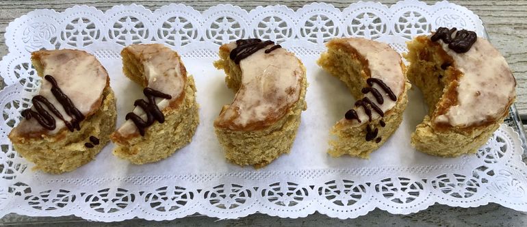 Den Kuchen auskühlen lassen und inzwischen für die Glasur etwas Eierlikör (nach Wunsch auch andere Flüssigkeiten) mit Staubzucker gut verrühren. Den Kuchen glasieren, etwas antrocknen lassen und vorsichtig Monde ausstechen.