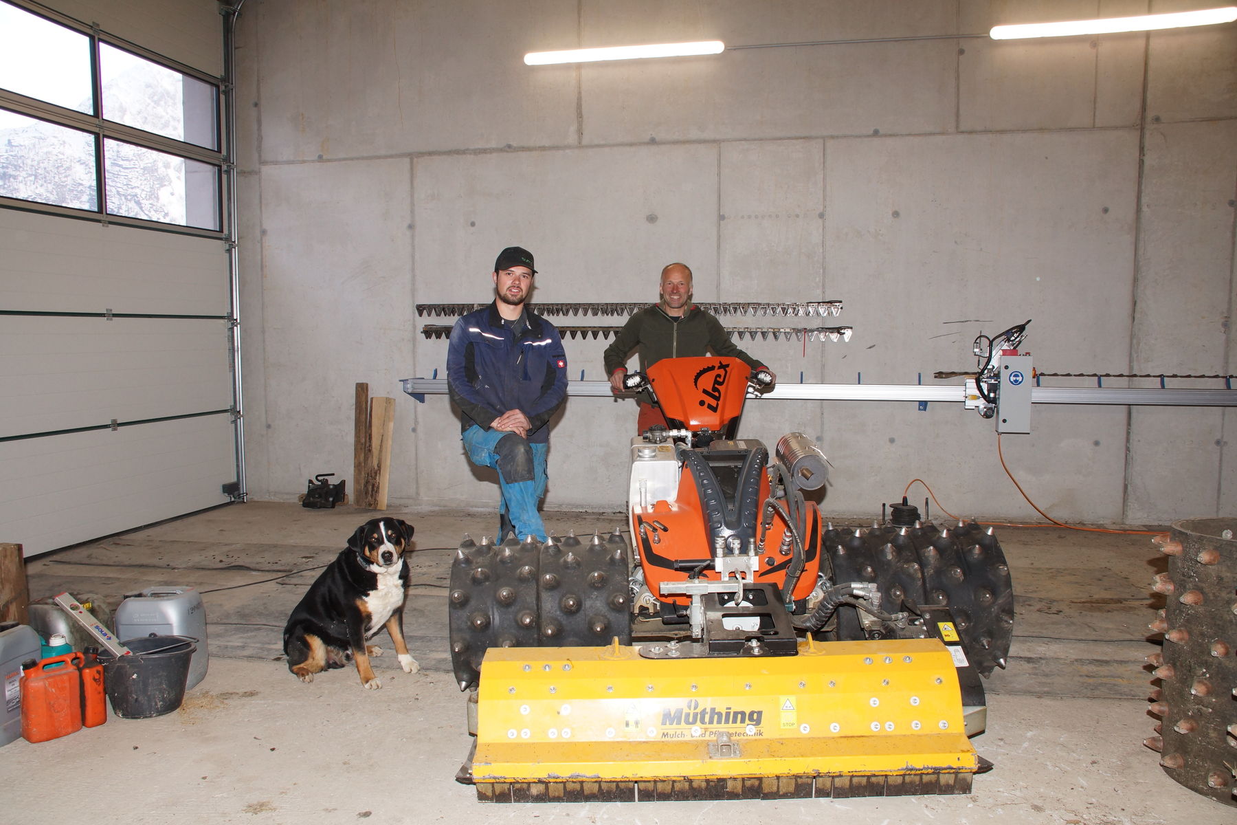 Herbert und Hannes mit dem Motormäher und einem vollautomatischen Schleifgerät im Hintergrund. © Gudrun Dürnberger