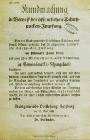 Für die Stadt Salzburg rief der damalige Bürgermeisterstellvertreter Dr. Poschacher 1894 zur öffentlichen Schutzimpfung auf. © Archiv/Standl