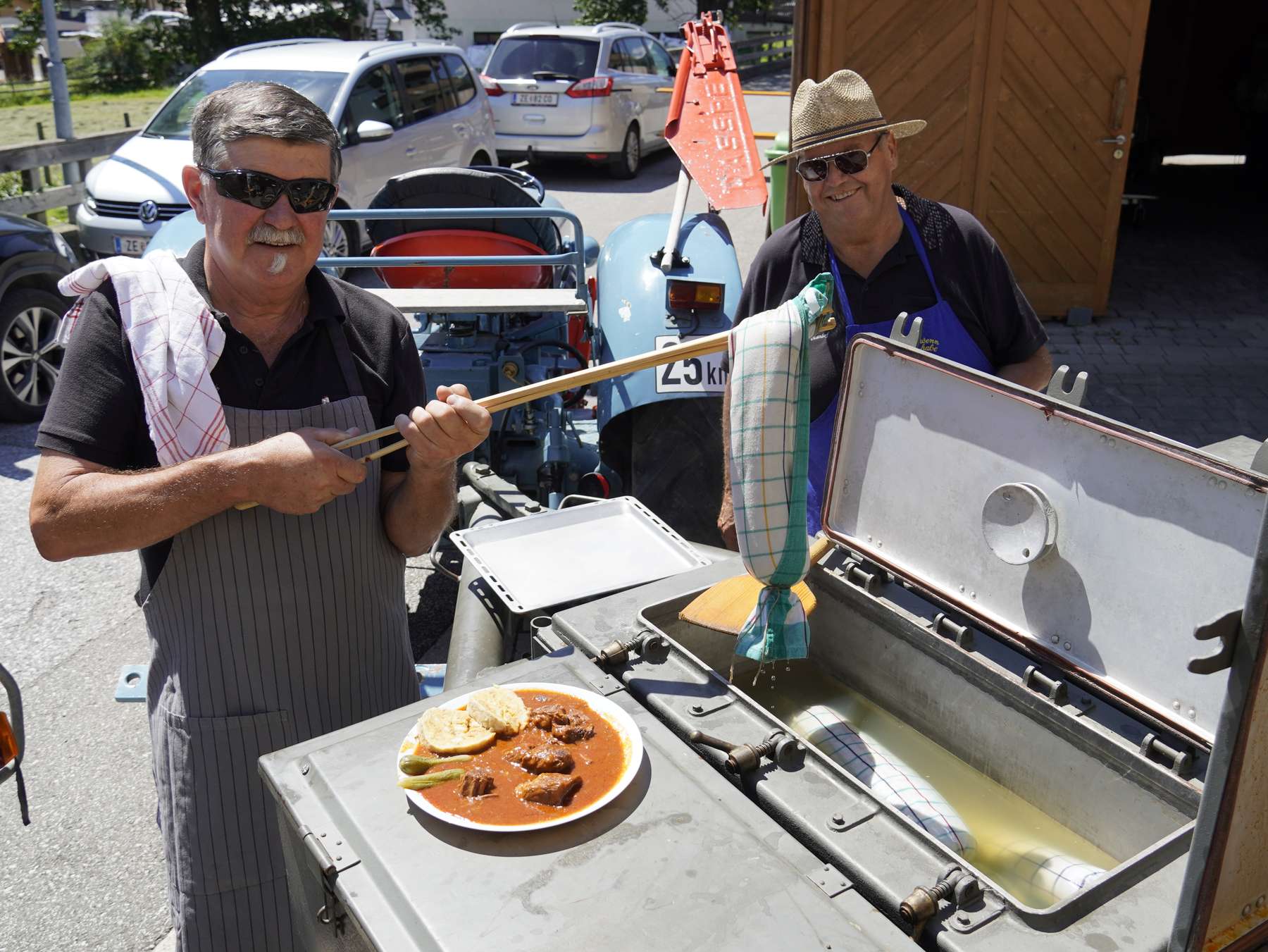 Zu Mittag wird stets frisch aufgekocht, von einem Verein, den Bäuerinnen, einem Wirt etc. Im August sorgte der Piesendorfer Traktorverein für das Essen. Obmann Franz Steger und Hans Möschl machten 120 Portionen Gulasch mit Semmelknödel in einer Gulaschkanone. 27 Kilo Rindfleisch von der Metzgerei Schultes wurden dafür verwendet.