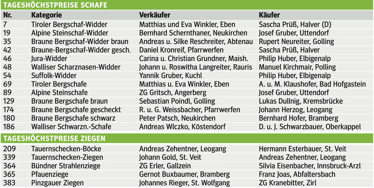 Den Anfang der Versteigerung machten die Ziegen, wo es bei den Tauernschecken-Ziegen mit ca. 150 angemeldeten Tieren das größte Angebot gab, gefolgt von Pinzgauer Ziegen. Beide Rassen fanden auch dieses Mal wieder einen guten Absatz und konnten entsprechende Zuschlagspreise erzielen. Erwähnenswert ist auch, dass bei der Vielzahl an Tauernschecken-Ziegen ein Durchschnittspreis von über 700 Euro erzielt werden konnte. Auch die angemeldete Bündner Strahlenziege und die Pfauenziege konnten den Besitzer wechseln. Nur bei den Tauernschecken-Böcken überstieg, wie im Herbst üblich, das Angebot die Nachfrage.