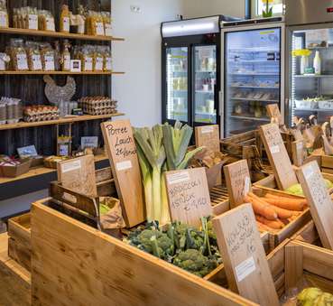 - Bevorzugen Sie natürliche Materialien. Holzkisten oder Weidenkörbe verstärken die bäuerliche, authentische Atmosphäre. Die Produkte sollten übersichtlich angeordnet und leicht zugänglich sein.