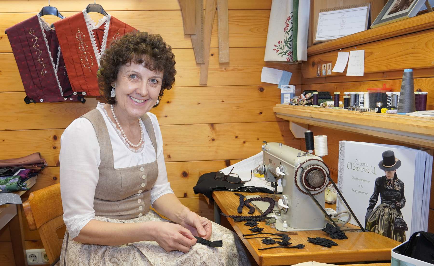 Die Schneidermeisterin ist auf die Herstellung und Restaurierung von Steppmieder und Garnierspenzer, dem sogenannten Überrock, spezialisiert. Über diese Festtracht hat sie  mit Unterstützung eines kompetenten Teams ein informatives und schönes Buch geschrieben