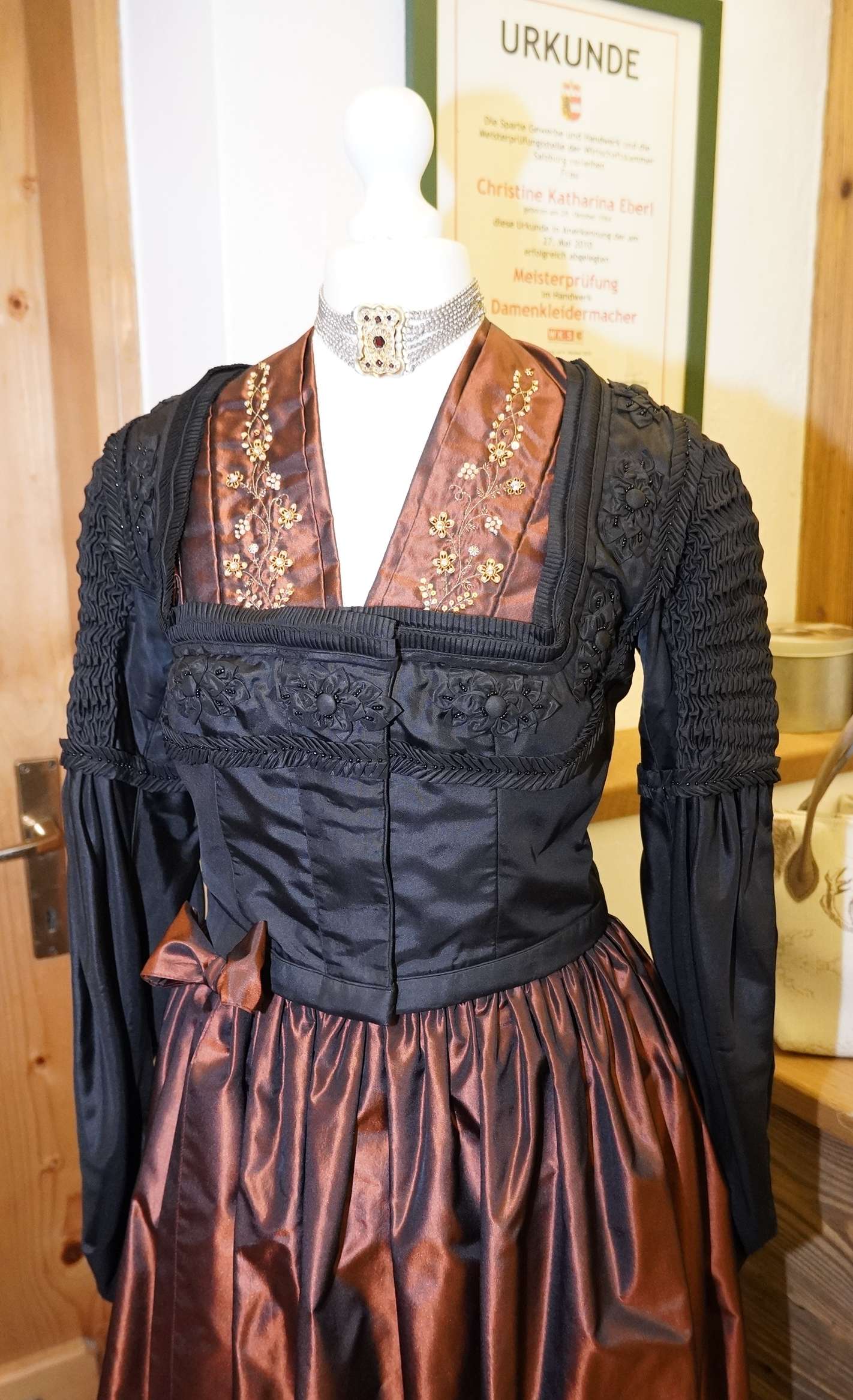Talent und Ehrgeiz hat Christine Eberl bereits als Lehrling bewiesen. In ihrer Werkstatt hängt ein Foto von der Ehrung, als sie im dritten Lehrjahr Landesmeisterin geworden ist. Es folgten weitere Auszeichnungen, welche die Wände schmücken. Darunter auch die Urkunde von der Anerkennung des Überrocks als immaterielles Kulturerbe der Unesco. Die Leogangerin hat dafür die Bewerbung eingereicht, damit ist ihr eine sensationelle Pionierleistung gelungen.