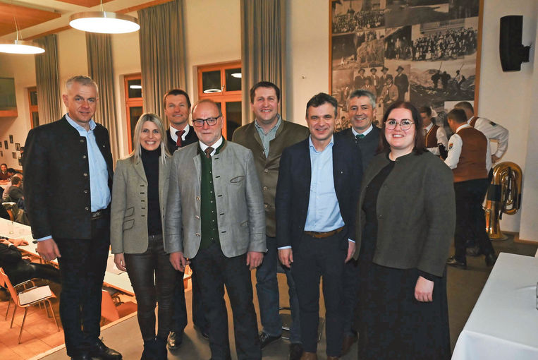 Besonderer Dank von Publikum und Ehrengästen an Obmann Gfrerer. Im Bild von rechts Bürgermeister Bernhard Weiß, LAbg. Sabine Klausner, Bezirkshauptmann Harald Wimmer, Silvester Gfrerer, LAbg. Hannes Költringer, LK-Präsident Rupert Quehenberger, BBK-Sekretär Gottfried Rettenegger und Nationalratsabgeordnete Carina Reiter © Dürnberger