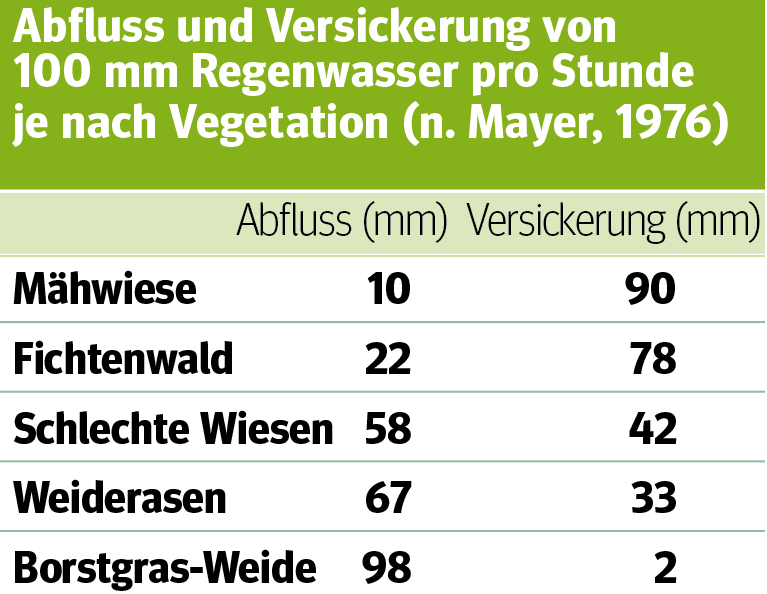 Eine intensive Mähwiese kann doppelt so viel Wasser aufnehmen wie eine extensiv genutzte Wiese. Auf einer nicht gedüngten Bürstlingwiese fließt das Regenwasser fast zur Gänze oberflächig ab, weil sich die Pflanzen letztlich umlegen und dann wie ein Schilfdach wirken. Damit bleibt wenig Wasser zur Sickerwasserbildung übrig.