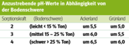 Liegt der pH-Wert unterhalb des angestrebten pH-Wertes, so ist eine Aufkalkung erforderlich, wobei die Einzelgaben nicht über 1,5 t CaO/ha (in Abstand von zwei Jahren) betragen sollen, d. h. maximal drei Tonnen Kohlensauer Kalk als Einzelgabe.