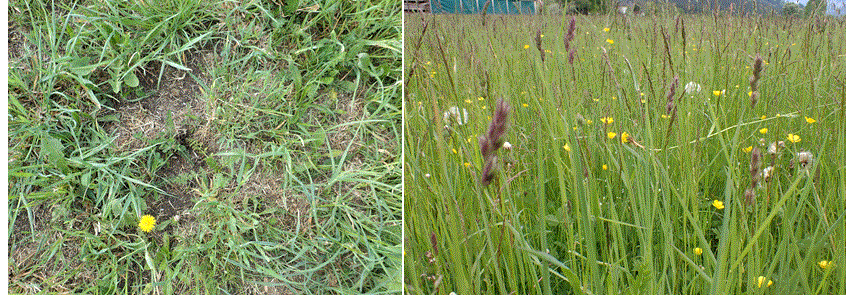 Weidemanagement: Trennung von Wiese und Weide -er Goldhafer ist nicht trittfest und wird bei stärkerer Beweidung schnell zurückgedrängt, jedoch nur im Frühjahr und Sommer! Die Weiden werden mit den Mischungen KWEI oder NAWEI übergesät, um eine dichte Grasnarbe zu erhalten. Die Nach- oder Vorweide von Goldhaferwiesen mit gefährdeten Tieren ist jedenfalls problematisch, da dieses Gras sowohl im Frühjahr zeitig wie auch im Herbst spät austreiben kann und dann den Tieren praktisch nur junger Goldhafer mit hohem Vitamin D-Anteil zum Weiden bleibt.