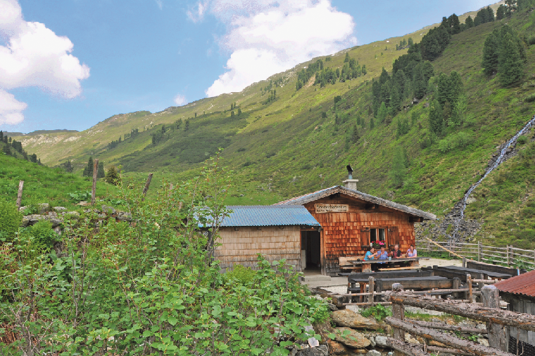 Die Almhütte ist 1978 wieder neu aufgebaut worden, nachdem im Winter die Staublawinen großen Schaden anrichten können. Deshalb ist diese Hütte besonders flach gebaut, denn in schneereichen Wintern ist die Hütte komplett eingeschneit und damit besser geschützt.