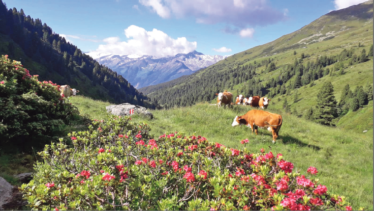 Zur Grundalm gehören 8 ha Almfutterfläche, die sehr intensiv genutzt werden können. Sowohl die Hinteralm als auch die Hochalm mit den gemeinsamen 160 ha sind stark mit Almrosen und Zirben verwachsen, somit bleibt davon noch eine Almfutterfläche von 60 ha über. „Meinem Mann Christoph und mir ist es sehr wichtig, unsere Fleckviehherde regelmäßig zu sehen und nach den Tieren zu schauen. Durch die Selbstständigkeit von Christoph verlagern sich diese Tätigkeiten in die Abendstunden, aber wir schätzen jede gemeinsame Zeit auf der Alm.“