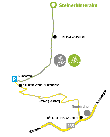 Kurz nach Neukirchen, in Fahrtrichtung Krimml, zweigt rechts die Panoramastraße Rossberg ab. Dieser Weg führt zu zwei möglichen Wanderungen: zum einen ab dem Bauernhof Taubenstein durch den Waldsteig in ca. 2 h zur Alm oder über den Almweg ab Alpengasthof Rechtegg. Eine dritte Variante ist eine Bergfahrt mit der Wildkogelbahn in Neukirchen mit einem Abstieg über die Geigenscharte in 2,5 h durch den Zirbenwald bis zur Steinerhinteralm. Begleitet wird man von einem einzigartigen Blick auf den Großvenediger und die umliegenden Hohen Tauern.