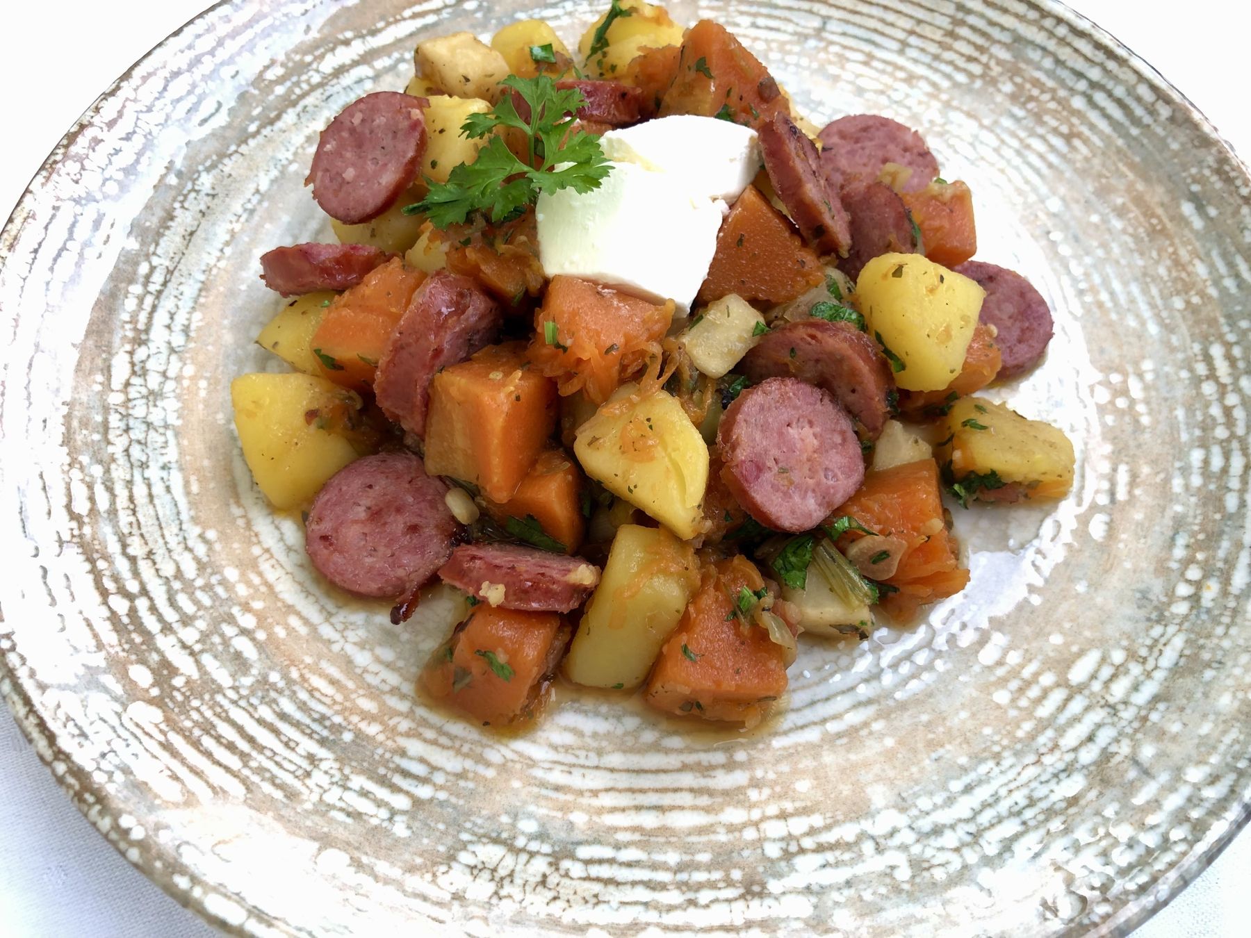 Erdäpfel und Sellerie in größere Würfel schneiden und kochen. Zwiebel und Speck anrösten, gewürfelten Kürbis dazugeben und durchrösten. Gewürze zugeben, mit Gemüsesuppe aufgießen und kurz köcheln. Der Kürbis soll noch knackig sein. Würste in Scheiben schneiden, kurz anbraten und mit den gekochten Erdäpfeln, Sellerie, Essiggurkerln und Petersilie zum Kürbisgemüse geben. Gut durchmischen und pikant abschmecken.