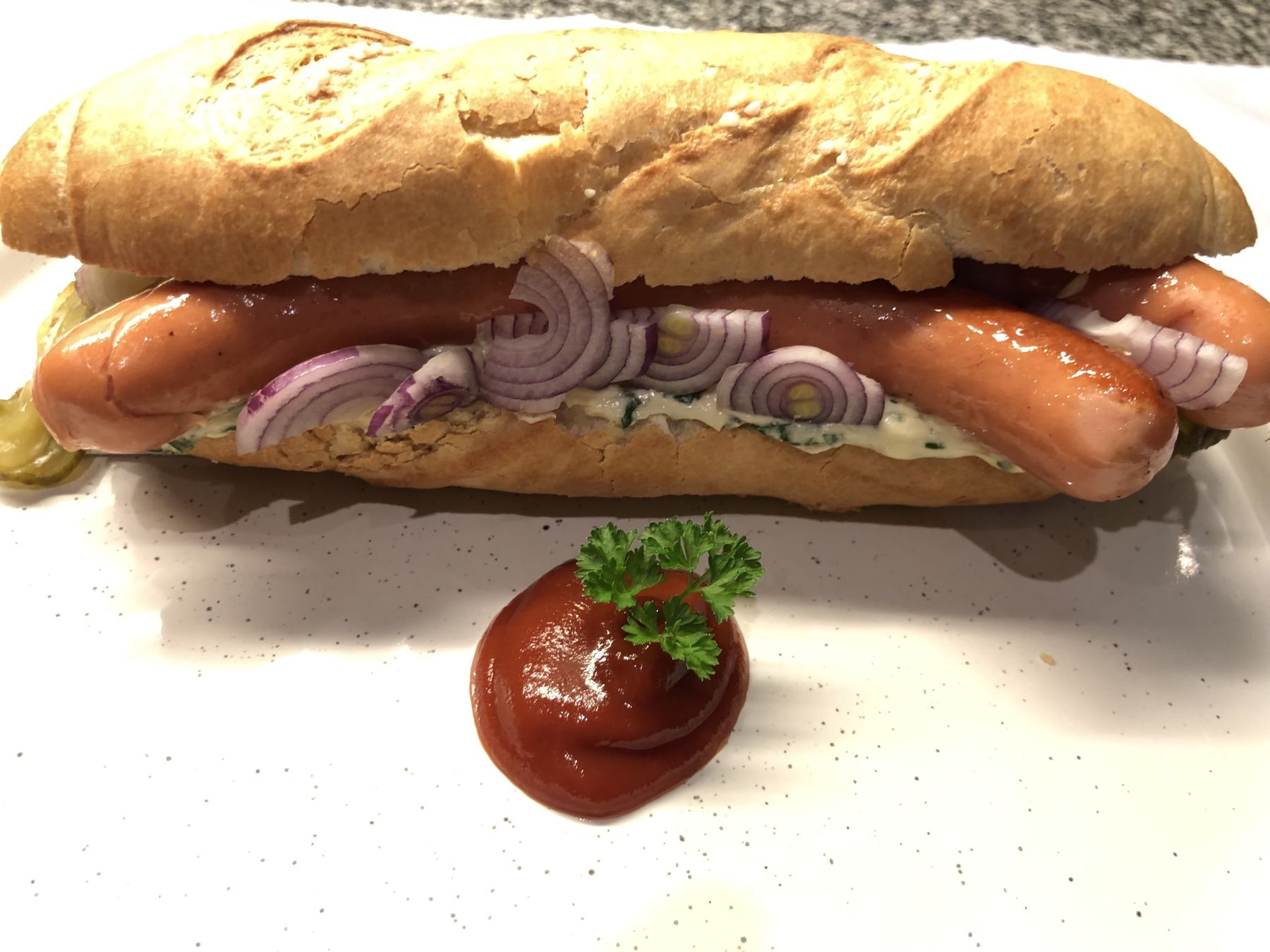 Zwiebel in Ringe schneiden, das Baguette der Länge nach aufschneiden (nicht durchschneiden), aufklappen und im Rohr kurz toasten. Aus Mayonnaise, Petersilie und Senf eine Creme bereiten und die untere Hälfte des Brotes damit bestreichen. Auf die Creme Kren und gehackte Essiggurkerl streuen. Gebratene oder gekochte Würstel auflegen und mit Ketchup bestreichen. Mit Zwiebelringen belegen, Deckel zuklappen, leicht andrücken und sofort genießen.