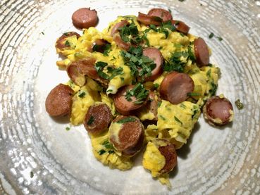 Gehackte Zwiebeln in Butterschmalz anrösten und geschnittene Würstchen mitrösten. Eier zerschlagen, mit Salz, Pfeffer und grüner Petersilie würzen und über die gebratenen Würste geben, bis die Eiermasse stockt. Mit grüner Petersilie bestreuen und mit Brot servieren.
