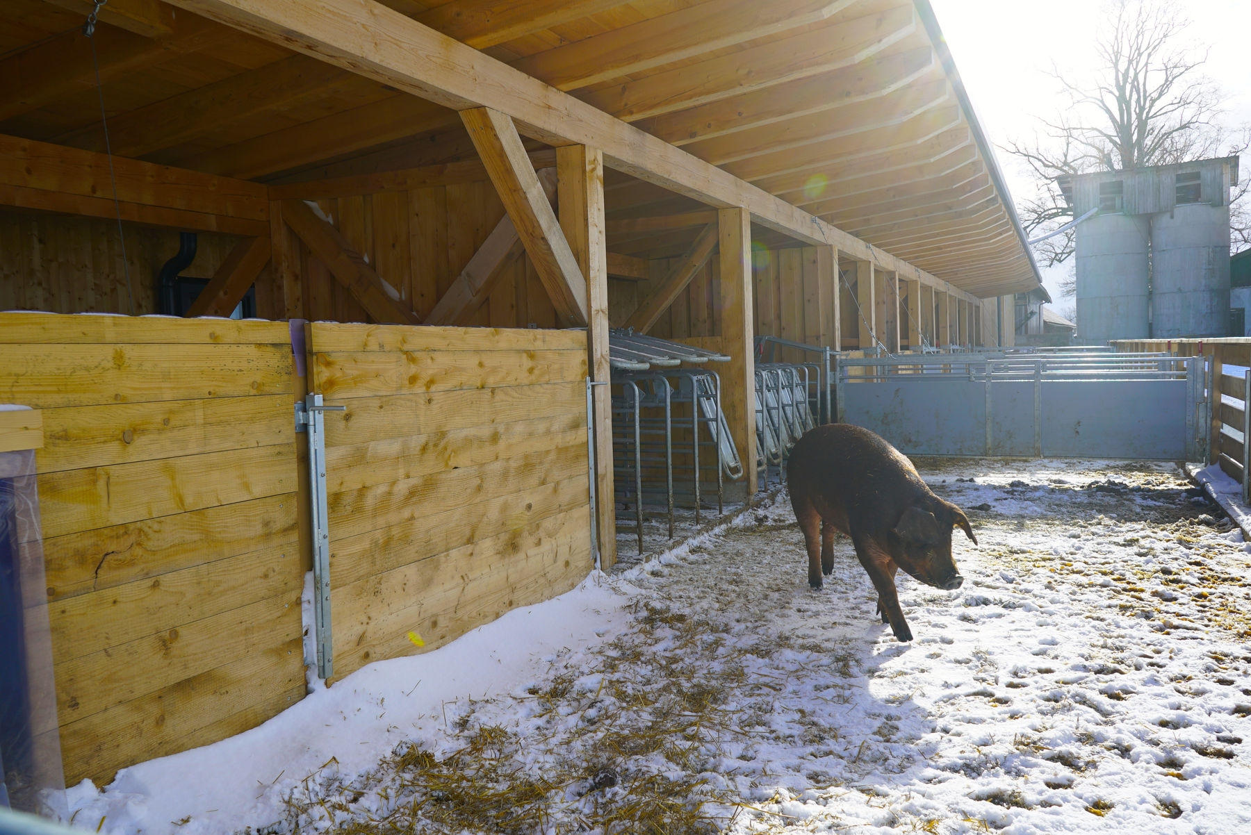Der Freilaufstall ist in einzelne Boxen unterteilt, je nach Alter der Schweine. In jedem Abteil gibt es eine Tiefstreu-Schlafbox mit Stroh. „Der Stall ist so konzipiert, dass die Tiere gerade Wege zwischen den Abteilen haben und so ganz einfach und ruhig wechseln können“, erklärt Josef.