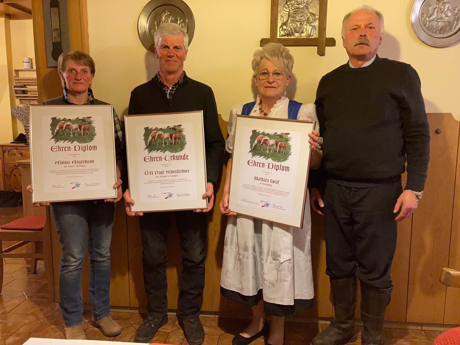 Bei der Jahreshauptversammlung des Haflingervereins Lungau wurden Aloisia Angermann für ihre 35-jährige Geschäftsführertätigkeit, Ök.-Rat Paul Schreilechner für seine 45-jährige Vereinstätigkeit und Obfrau Barbara Graf für ihre 20-jährige Tätigkeit als Vereinsobfrau geehrt. Wir gratulieren recht herzlich!