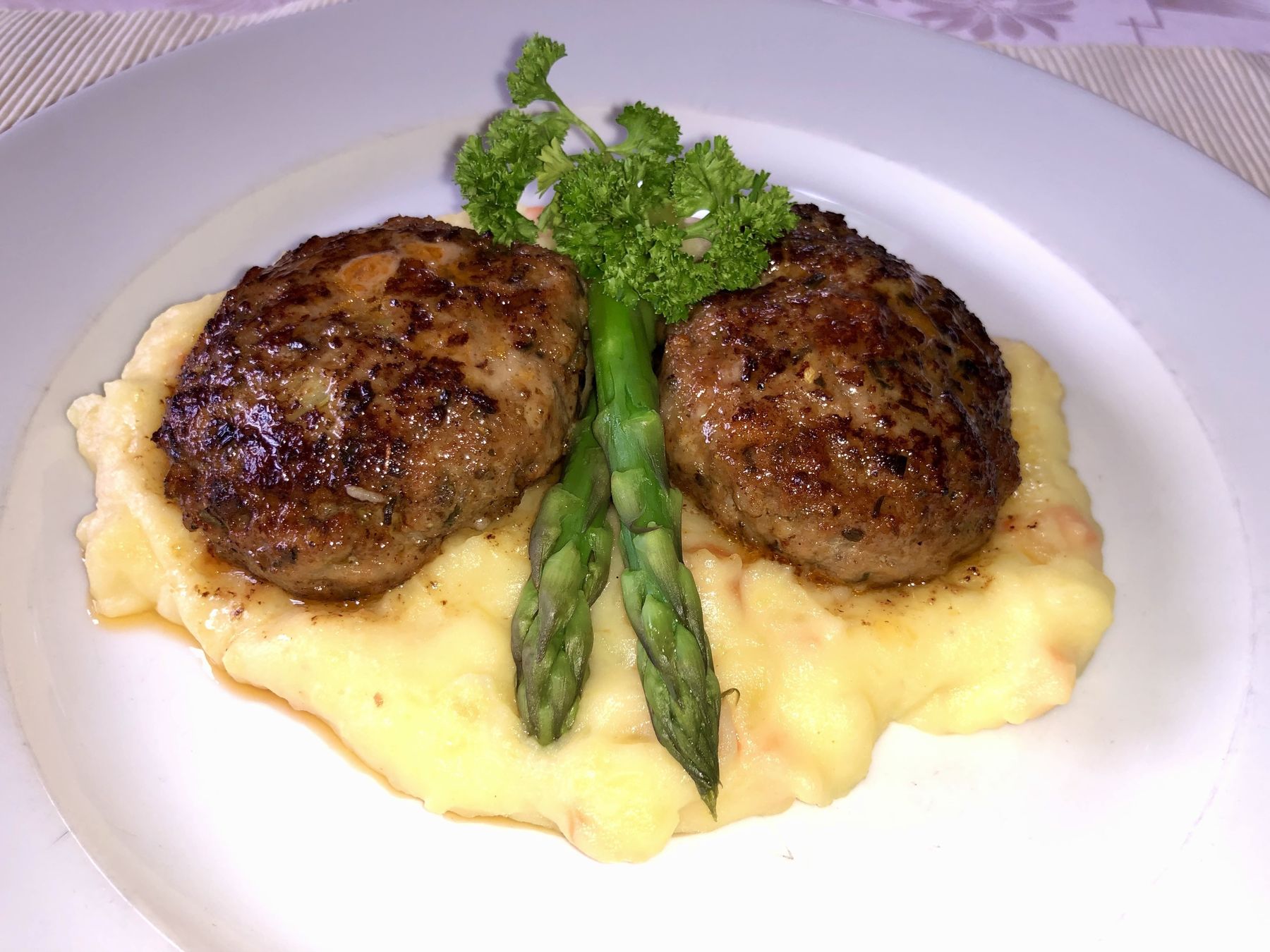 Zwiebel fein schneiden und in Butterschmalz anbraten. Bratwürstelbrät aus dem Darm drücken, eingeweichte Semmeln gut ausdrücken und alle Zutaten für die faschierten Laibchen zusammenmischen und gut durchkneten. Pikant abschmecken, mit nassen Händen Laibchen formen, in Semmelbröseln wälzen und in Butterschmalz herausbraten.