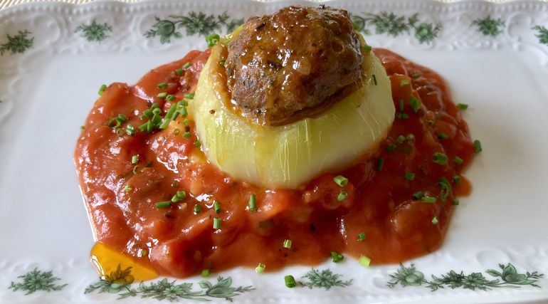 Kohlrabi schälen und das obere Drittel abschneiden. Kohlrabi mit einem Löffel vorsichtig aushöhlen und Kohlrabi blanchieren. Für die Fülle alle Zutaten zusammenmischen und gut abschmecken. Die blanchierten Kohlrabi mit der Fleischmasse gut befüllen und in eine mit etwas Suppe gefüllte Form stellen und bei 180 Grad knusprig backen.