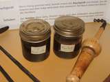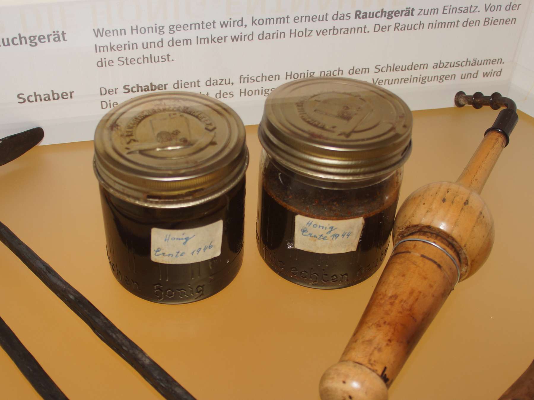 Man erfährt beispielsweise, dass 1947/48 unglaubliche Mengen Honig geerntet werden konnten. Eine günstige Wetterlage und das Auftreten vieler Blattläuse hatten zu einer willkommenen Rekordmenge an Honig geführt. Die Imker verfügten aber über zu wenige Gefäße und behalfen sich damit, dass sie den Honig auch in Badewannen füllten. Es sind sogar noch Gläser mit Honig aus den 1940er-Jahren vorhanden (siehe Abbildung links). Den könne man noch ohne weiteres essen, erklärt die Chefin des Hauses, erlaubt aber leider keine Kostprobe. Es gibt aber nicht nur faszinierende historische Utensilien wie Bienenkörbe, wunderschön bemalte Stöcke und Räuchergefäße zu bewundern.
