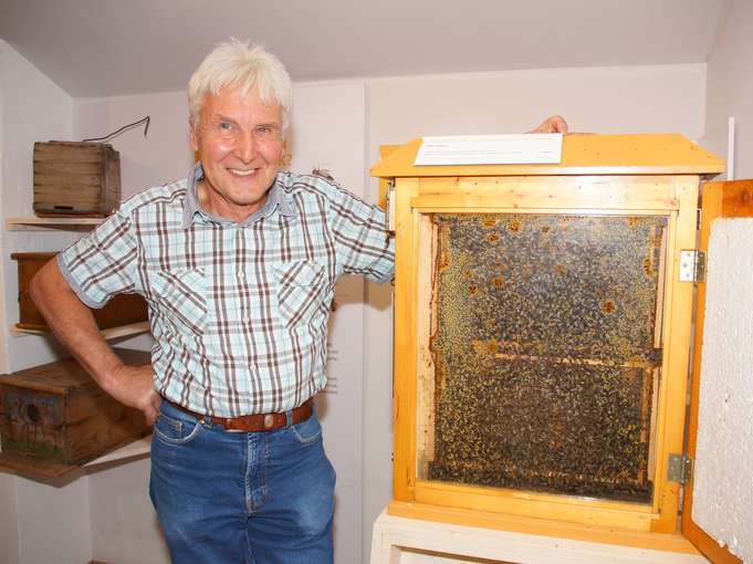 Im Museum ist auch ein Schaubienenstock mit lebenden Bienen beheimatet. „Die Besucher sind fasziniert und freuen sich, wenn sie die Königin entdecken“, schildert Waltraud. „Heuer durften die Bienen sogar erstmals im Museum überwintern. Das hat sehr gut funktioniert.“ Betreut wird der Stock von Sepp Fritz, Imker aus Leidenschaft. Das Handwerk hat er von seiner Großmutter, der Peilberghofbäuerin, gelernt. „Früher gab‘s ja fast auf jedem Hof Bienen. Oft haben die Frauen diese Arbeit gemacht, auch wenn man heute meist denkt, das wäre Männersache gewesen“, schildert der Hobbyimker, der zwischen zehn und 15 Völker besitzt, die seinen großen Obstgarten bestäuben.