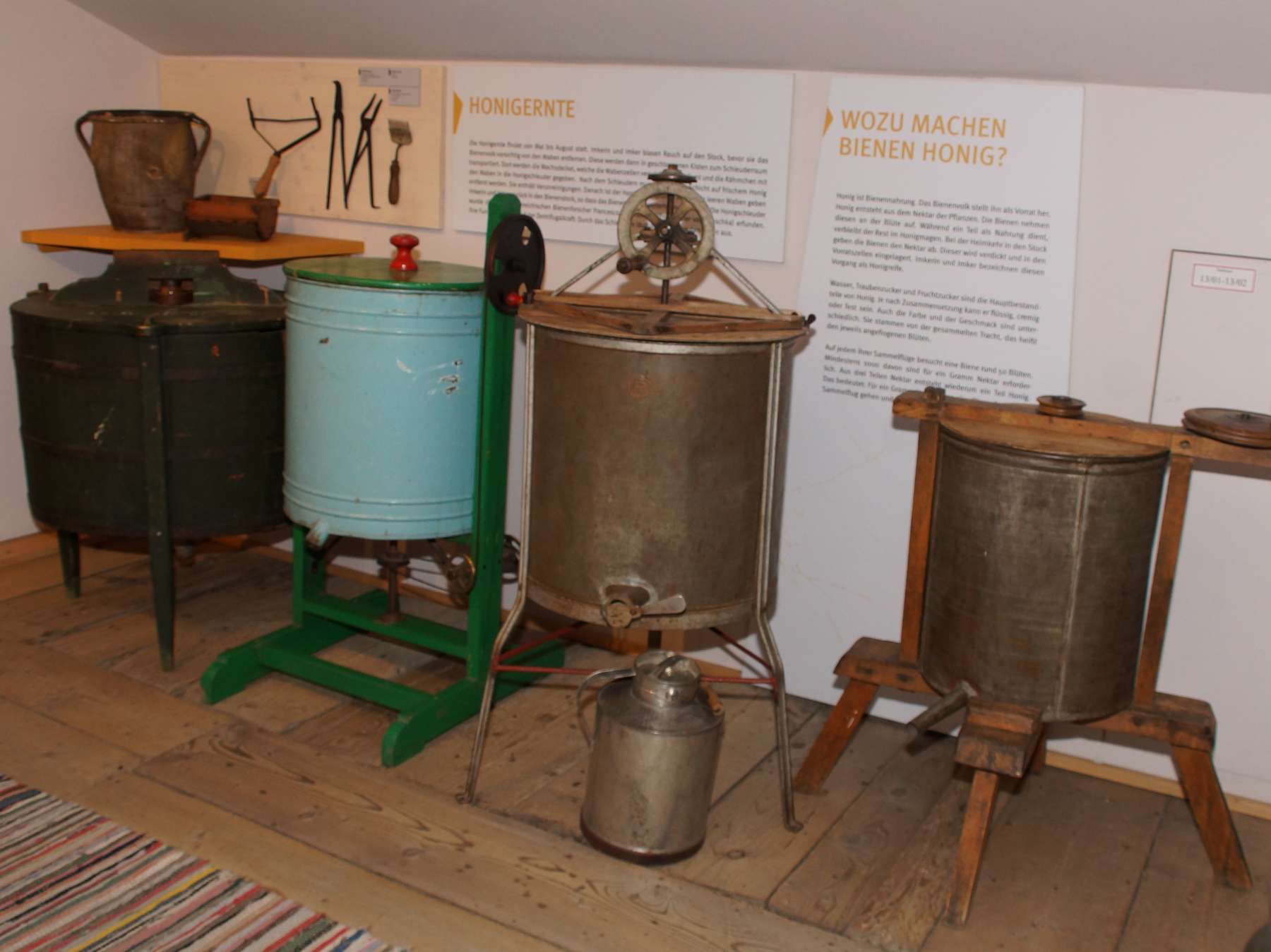 Die Sammlung wurde bereits 1979 eröffnet, im Freigelände steht auch ein altes Bienenhaus, das bald restauriert wird. Kustodin Waltraud Moser-Schmidl führt durch die umfangreiche Ausstellung und beginnt bei den vielen unterschiedlichen Bienenkörben. Es sind die ältesten Behausungen, die der Mensch für die Wildtiere gebaut hat, um ihnen Nisthöhlen zu schaffen. Solche Körbe finden heute kaum noch Verwendung, da die Waben für die Ernte nur entnommen werden können, indem sie zerstört werden. Eine revolutionäre Veränderung war daher 1853 die Entwicklung von beweglichen Holzrahmen. Nur wenige Jahre später erfand ein österreichischer Major die erste Honigschleuder, die eine große Erleichterung bei der Gewinnung von Honig bedeutete. Im 18. und 19. Jahrhundert entstanden auch erste Imkervereinigungen und -zeitungen.