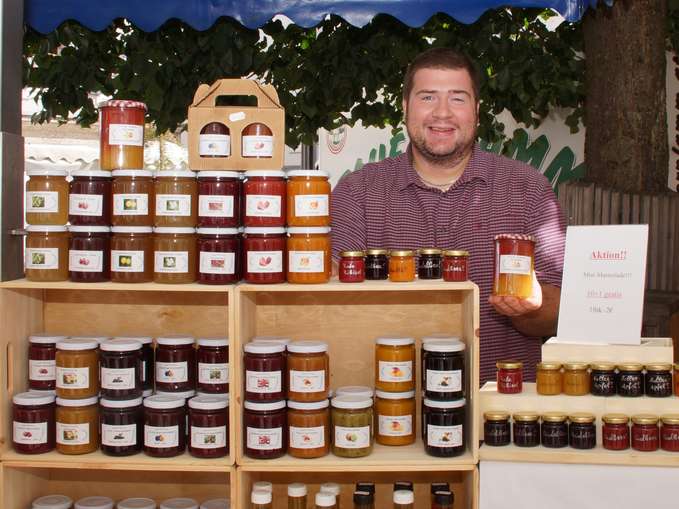 Sie teilen sich am Stadtmarkt in Zell einen Stand mit Christian und Adelheid Ahorner, die als Köche im Hotel Künstleralm in Kaprun arbeiten. Das Paar hat sich auf Sirupe und Marmeladen spezialisiert, die keine Geschmacksverstärker und Konservierungsmittel enthalten. „Unsere Produkte sind trotzdem zwei Jahre lang haltbar, aber die Farbe verändert sich mit der Zeit. Am besten werden sie sofort konsumiert“, empfiehlt Christian. Viele Zutaten wie Kräuter und Blüten stammen aus dem riesigen Garten seiner Oma, die Beeren werden im Oberpinzgau von Helferinnen geerntet.