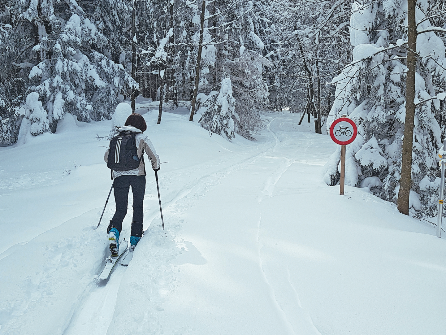 Durch das allgemeine Betretungsrecht nach dem Forstgesetz können Forststraßen für Schitouren genützt werden, während sie für Mountainbiker gesperrt sind. © Lienbacher