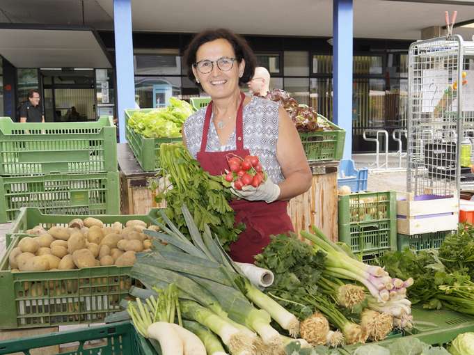 Routiniert bedienen Christine und ihr Team die Kunden und Kundinnen, die sich um ihren Stand am Wochenmarkt drängen. Der Ansturm scheint den Damen nichts auszumachen. Die Chefin blickt immerhin bereits auf mehr als 30 Jahre Erfahrung in der Direktvermarktung zurück.