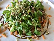 Eine würzige Marinade aus Essig, Öl, Senf, Honig und Salz schütteln, Salate verlesen und kunterbunt auf einem Teller anrichten. Die Marinade über den Salat träufeln und mit vielen Sprossen garnieren.