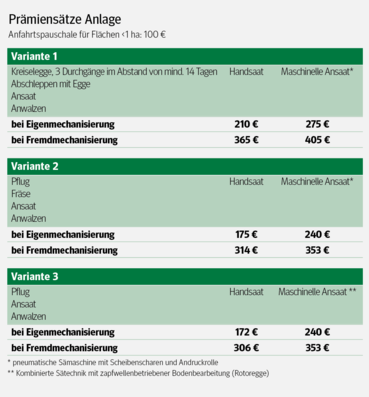 • Einmalig (pauschal) die Kosten für die Neuansaat (siehe Kasten "Prämiensätze Anlage“)