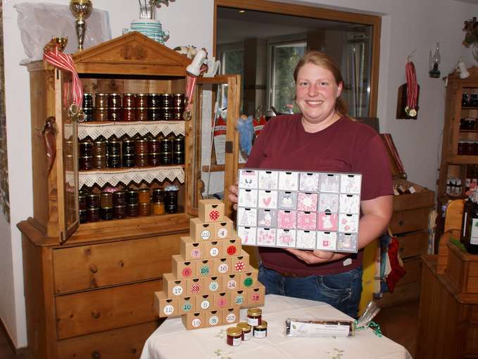 Sehr beliebt sind auch die Schnäpse und Liköre aus dem eigenen Obst. Die hübschen Flaschen sind häufig Teil der Genusspakete, die neben Privatkunden vor allem für Hotels, Firmen und den Tourismusverband liebevoll zusammengestellt werden. „Wir verwenden verschiedene Größen und versuchen jeden Kundenwunsch zu erfüllen“, versichert Melanie. Neben den Adventkalendern sind die Schachteln in der Weihnachtszeit beliebte Geschenke. „Bei uns darf aber auch etwas ausgehen. Wir sind kein Supermarkt und die Leute verstehen das auch.“