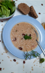 Die Rollgerste zusammen mit den Bohnen über Nacht im kalten Wasser einweichen. Am nächsten Tag die Gerste mit den Bohnen abseihen, mit kaltem Wasser wieder zustellen und zum Kochen bringen. Etwas köcheln lassen (bis sich ein weißer Schaum bildet, ca. 10 Minuten), nochmals abseihen und wieder mit kaltem Wasser (3 Liter) zum Kochen bringen. In der Zwischenzeit die Zwiebel schälen und kleinwürfelig schneiden, mit der Butter glasig anschwitzen lassen. Den Speck ebenfalls würfelig schneiden und mit der angeschwitzten Zwiebel unter die Suppe mischen, weiterköcheln lassen. Die Suppe so lange kochen, bis die Bohnen weich sind. (ca. 90 Minuten). Die Suppe mit Salz und Pfeffer sowie mit Suppenwürze kräftig würzen. Die Suppe vor dem Servieren mit Schnittlauch garnieren.