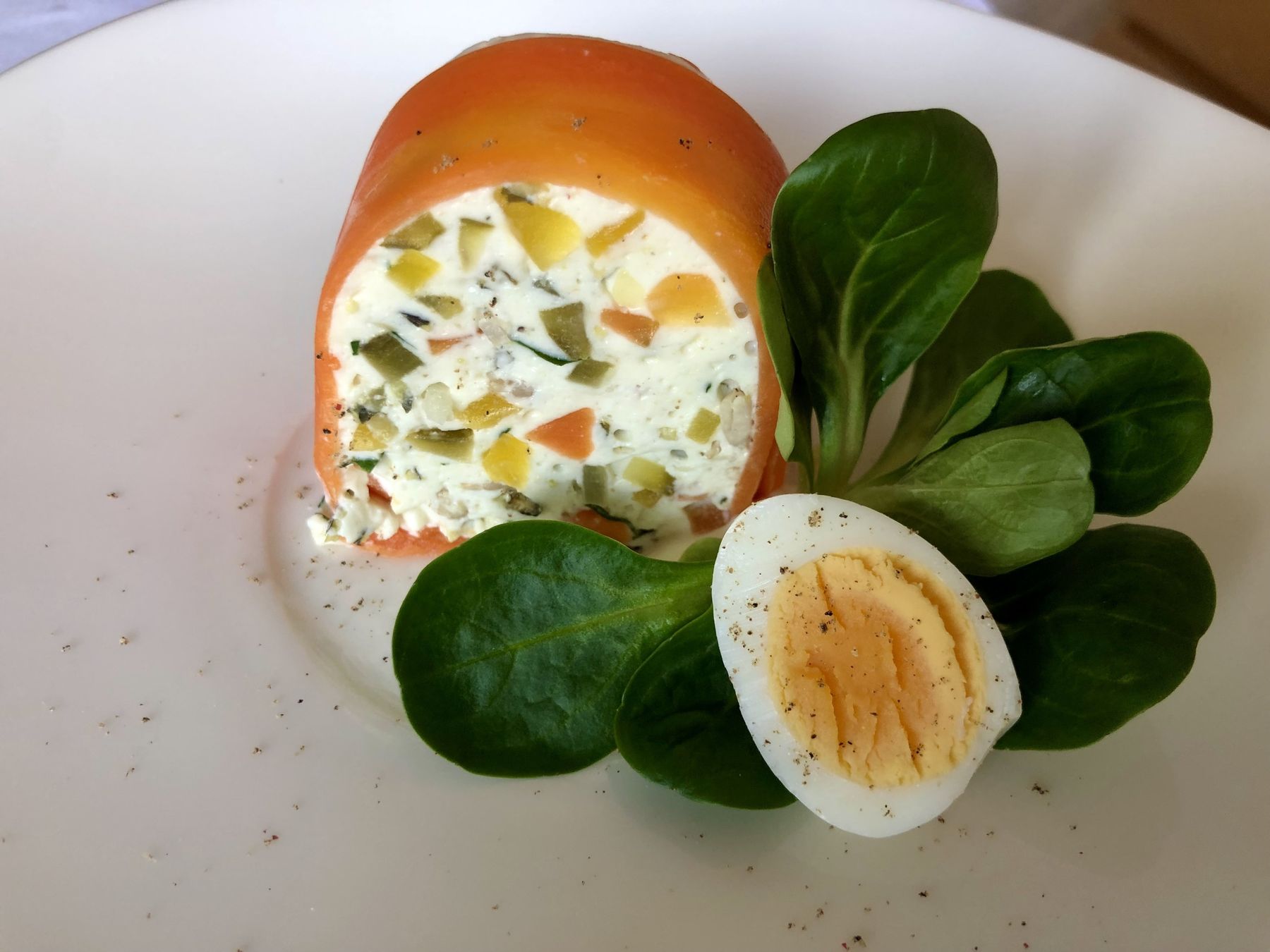 Dicke Karotten schälen und der Länge nach in feine, breite Streifen schneiden (Brotmaschine), diese blanchieren, sodass sie sich biegen lassen. Die Karotten auskühlen lassen und dachziegelartig in eine mit Klarsichtfolie ausgelegte und mit Öl bepinselte Terrinen-Form legen. Frischkäse mit allen Zutaten vermischen, würzig abschmecken und die aufgelöste Gelatine zackig einrühren. Die Frischkäsemasse in die vorbereitete Terrinen-Form füllen, gleichmäßig verteilen und die Terrine mit Klarsichtfolie abdecken und über Nacht in den Kühlschrank stellen.