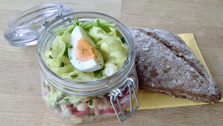 Gemüse und Apfel raspeln und Porree in feine Ringe schneiden. Alle Zutaten getrennt voneinander, farblich abgestimmt in ein Glas schichten, mit Sauce abdecken und den Schichtsalat mit geriebenem Käse und einem gekochten Ei garnieren. Den Salat vor dem Servieren etwas durchziehen lassen.