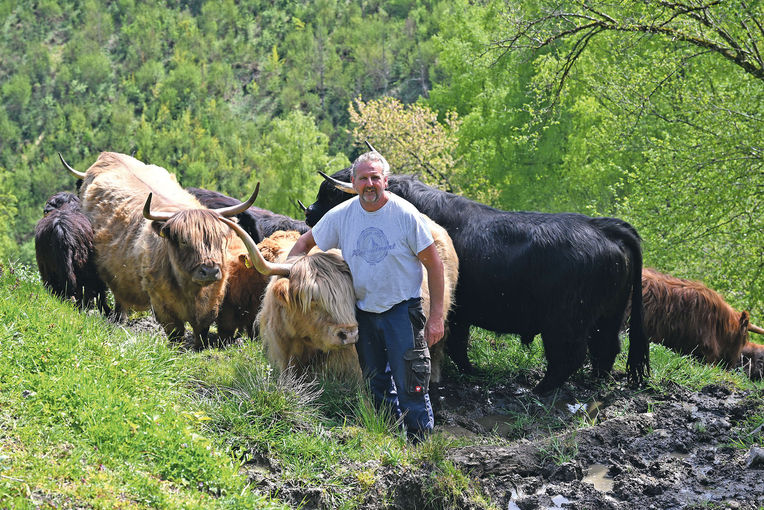 Christian Huber, Arlerschmied in Wagrain, ist vom Wesen und der Optik seiner Hochlandrinder-Mutterkühe beeindruckt. "Gesehen und schon verliebt", so beschreibt der Obmann der Arge Hochlandrind seine erste Begegnung mit den zotteligen Rindern. © Archiv