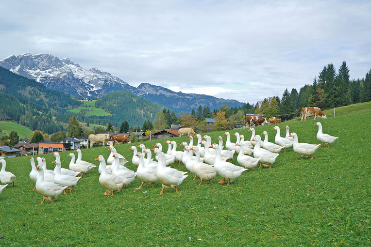 In 30 Wochen wachsen rund 100 Weidegänse beim Großschartengut von Familie Holzer in St. Martin am Tennengebirge zu einer regionalen Spezialität heran. © Archiv