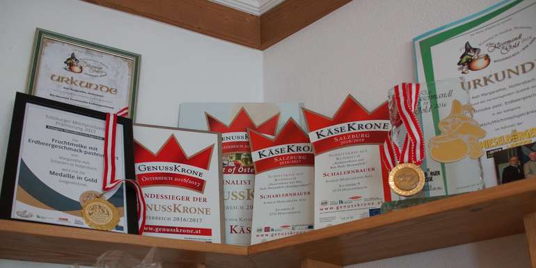 Die umfangreiche Trophäensammlung im höchstgelegenen Bio-Hofladen Salzburgs hat Zuwachs bekommen. Greti Astl hat bei der „Ab Hof“ Messe in Wieselburg wieder eine Goldmedaille für ihren köstlichen Latschenwipferl-Likör bekommen, ihr hervorragender Käse wurde mit Silber ausgezeichnet. Die vielen Preise sind die Anerkennung für die hochwertigen Produkte der Seniorbäuerin. Sie ist zu Recht stolz darauf. „Man wird fast unbescheiden, Bronze wäre mir zu wenig“, meint sie schmunzelnd. Nach mehreren „Genusskronen“ und „goldenen Stamperln“, die sie bereits eingeheimst hat, wäre ein Preis bei der Alpen-Adria-Verkostung ihr Wunschziel.