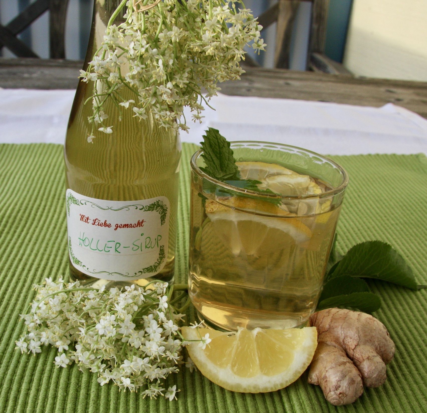Holunderblütensirup mit Giersch, Ingwer und Zitronenmelisse