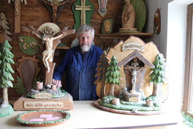 Albin Kreuzer stellt Schnitzwerke und Ziergegenstände aus Holz her.