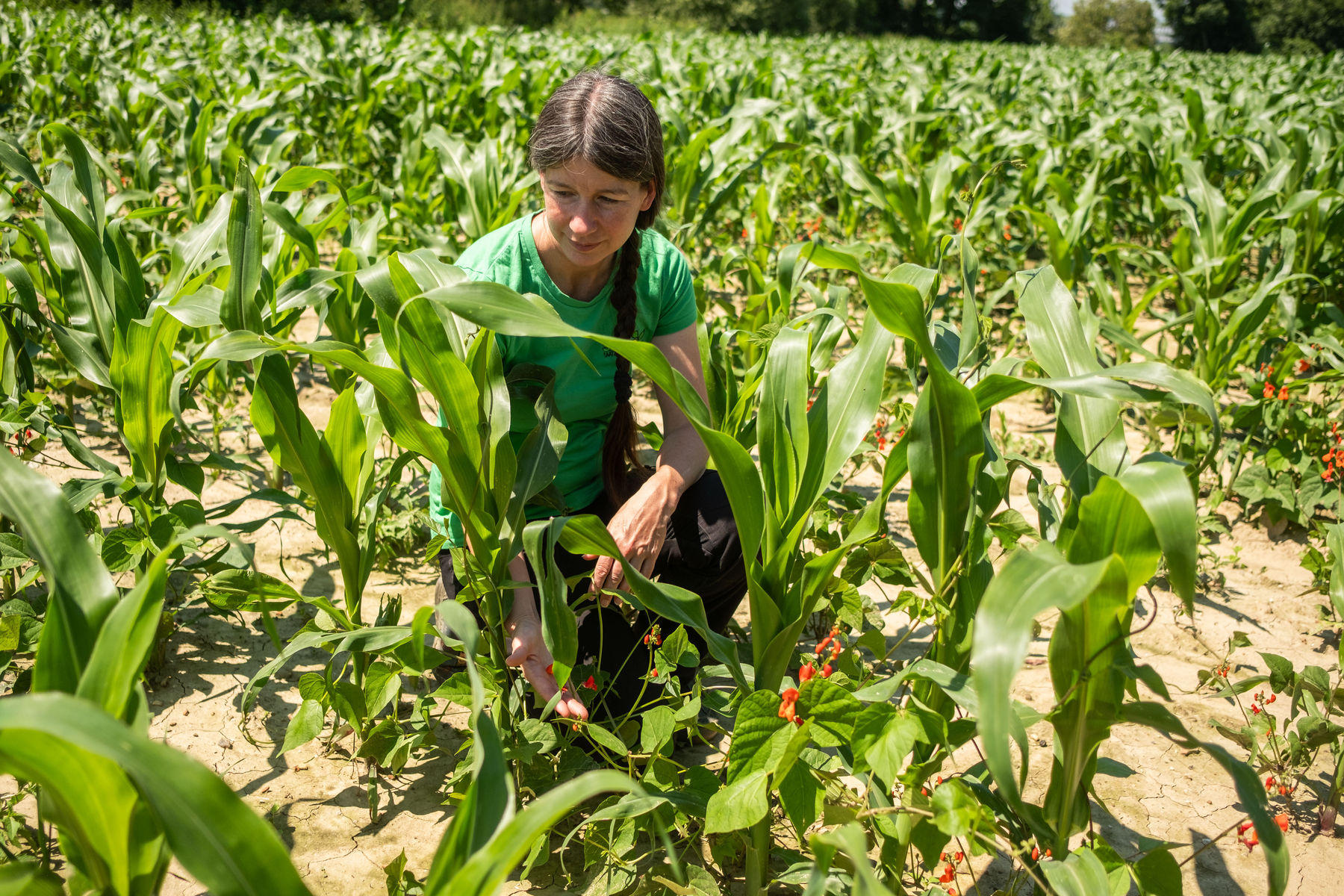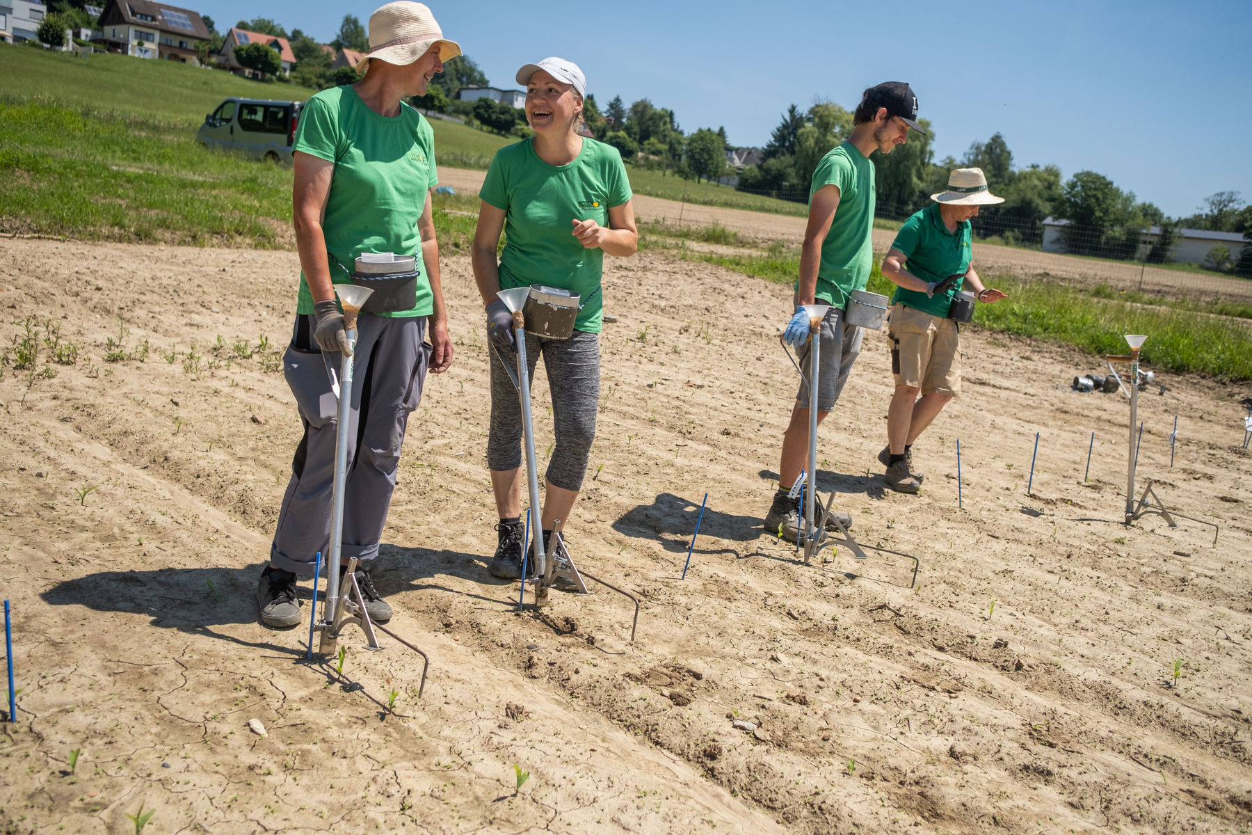 Auf den Flächen der Saatzucht Gleisdorf und weiteren Vermehrungsflächen wurde 2024 ein Teil des neuen Saatguts in Synthetiks mit zwei bzw. drei verschiedenen Komponenten unter praxisnahen Bedingungen zur Vermehrung in Mischkultur mit Mais angebaut. Ein weiterer neuer Synthetik mit fünf Komponenten wird auf einem Unterstützungsgerüst angebaut. Der Versuchsanbau erfolgt in genau ausgemessenen Plots (kleinen Teilflächen), wo das Saatgut mit Hilfe von Handsetzgeräten in regelmäßigen Abständen gesät wurde. Die Ernte wird händisch bzw. mit einem speziellen Dreschgerät erfolgen, um den Ertrag und andere agronomische Parameter möglichst exakt auswerten zu können.