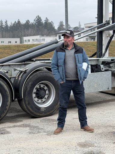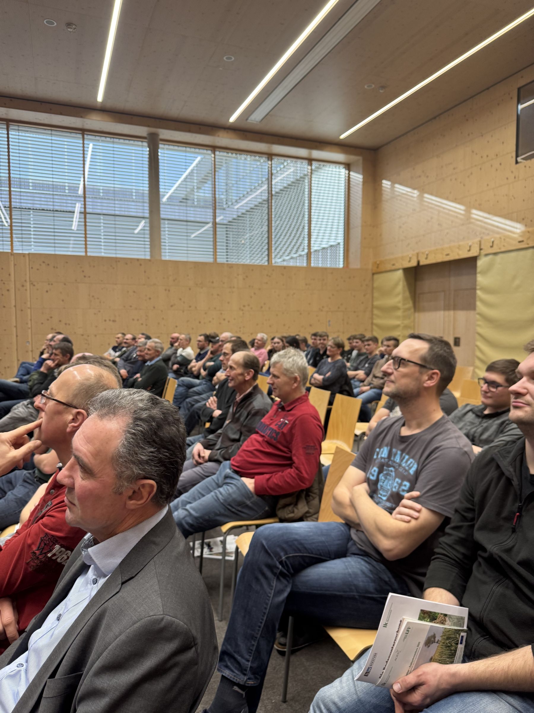 Nach den Fachvorträgen ging es auf den Schulhof, wo Landwirt Andreas Langer seinen Fuhrpark präsentierte. Langer bietet als Dienstleister des Maschinenrings die Ausbringung von Kalk an. Dazu hat der findige Landwirt ein eigenes mobiles Kalksilo sowie einen Kalkstreuer inklusive Stromversorgung direkt an der Frontzapfwelle des Traktors installiert. Das Publikum staunte über die Innovationskraft und die Leidenschaft für die Bodenverbesserung, die Langer ausstrahlte.
