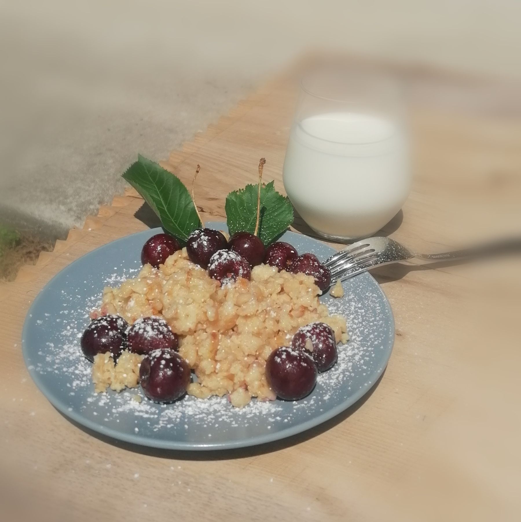 Milch in eine Pfanne geben und mit der Hälfte der Butter und Salz erhitzen. In der Zwischenzeit das Mehl in eine Schüssel geben und einen ganz dünnen Wasserstrahl in die Schüssel laufen lassen und gleichzeitig mit einer Gabel das Mehl durchquirlen, sodass kleine Nockerl entstehen. Wenn die Milch aufkocht, dann die ganzen Mehl-Nockerl in die Milch geben und mit einer Küchenhilfe gut durchstechen und verrühren. Wichtig: Ab jetzt nicht mehr von der Seite weichen, da es sehr leicht und schnell anbrennen kann. Immer wieder etwas Butter dazugeben und fest durchstechen und rühren. Wenn das Muas schon schön goldbraun ist (je nach Belieben, ob man es knuspriger oder weicher mag), die Kirschen für ca. fünf bis zehn Minuten unterheben, um diese zu erwärmen. Nun kann man das köstliche Muas mit Staubzucker bestreuen und mit einem Glas Milch servieren.