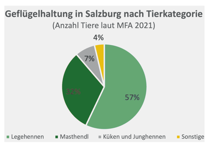 Laut Mehrfachantrag (MFA) 2021 wurden in Salzburg auf 4.085 Betrieben über 259.000 Stück Geflügel gehalten. Der Großteil davon entfällt auf Legehennen, die insgesamt fast 60% ausmachen und von über 3.900 Betrieben gehalten werden. Weitere 30 % sind Masthendl, deren Zahlen sich stark entwickelt haben in den letzten Jahren und die überwiegend biologisch gehalten werden.