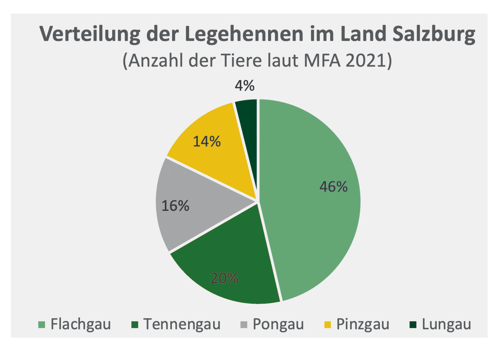 Die Tabelle "Verteilung der Legehennen im Bundesland Salzburg 2021“ zeigt die mengenmäßige Verteilung über die Bezirke. Fast die Hälfte aller Legehennen wird im Flachgau gehalten, was daran liegt, dass dort die größeren Hühnerbetriebe sitzen. Der Bioanteil ist mit 18% der gehaltenen Hühner im Flachgau am geringsten. Es zeigt sich, je weiter es Richtung Innergebirge geht, desto kleiner ist die durchschnittliche Hennenanzahl pro Betrieb und desto größer ist der Bioanteil.
