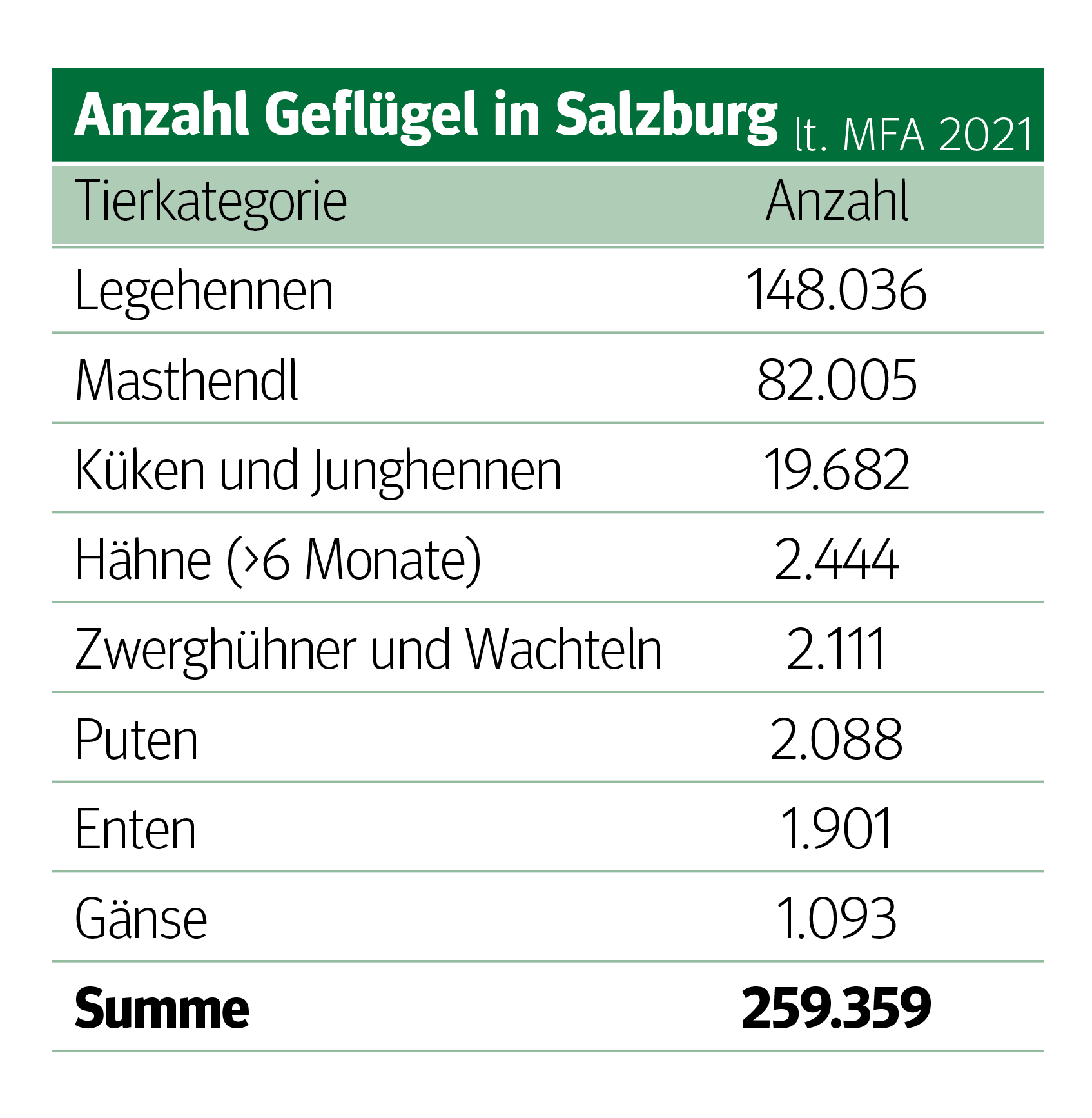 Ab 350 Stück Geflügel muss die Haltung amtlich registriert werden und die Geflügelhygieneverordnung eingehalten werden. Bei Legehennen erreichen in Salzburg gerade einmal 47 Betriebe diese Grenze. Nur 22 davon halten mehr als 1.000 Stück Legehennen. Der größte Betrieb in Salzburg hält 8.300 Stück Legehennen. Spezialisierte Hühnermäster gibt es sogar noch weniger: Nur zwölf Betriebe haben über 1.000 Mastplätze. Der professionellen Junghennenaufzucht widmen sich sogar nur zwei Betriebe mit bis zu 12.000 Tieren.
