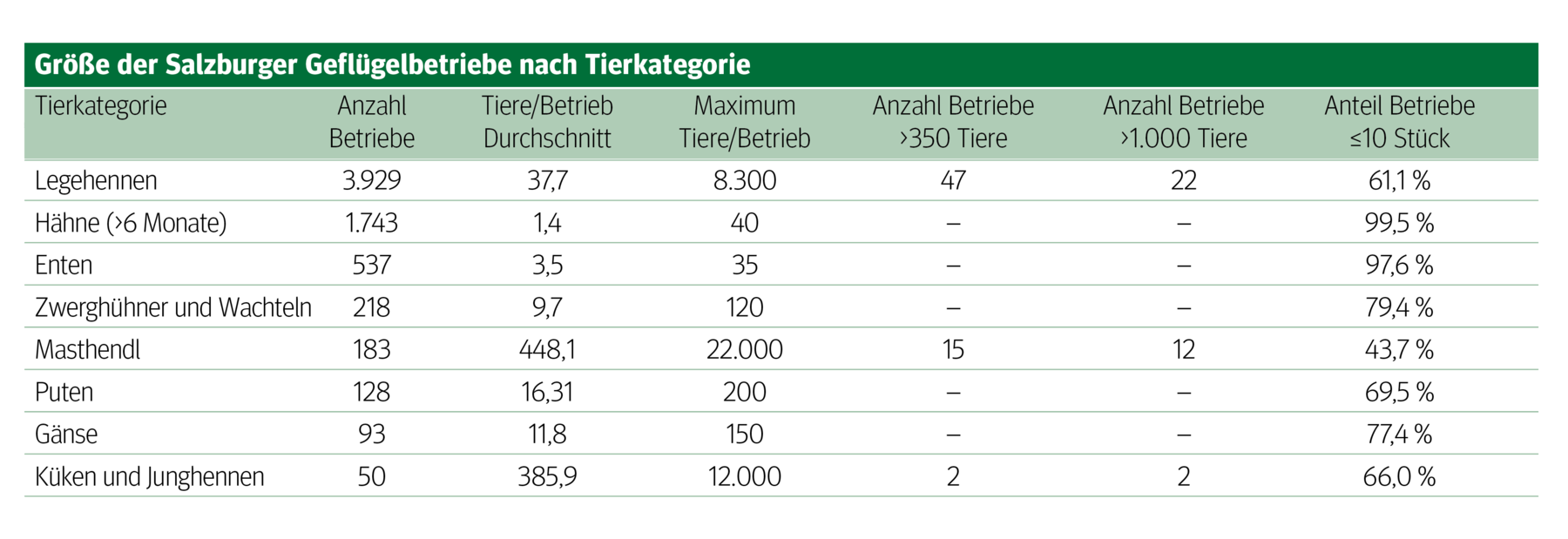 Der Trend zur Geflügelhaltung in den letzten Jahren zeigt sich auch in Salzburg. Er betrifft aber hauptsächlich Kleinsthaltungen im Bereich Hobby und Selbstversorgung bis hin zur Direktvermarktung. Die Tabelle "Größe der Salzburger Geflügelbetriebe nach Tierkategorien“ stellt die Größenverteilung der Salzburger Geflügelbetriebe dar. Es zeigt sich, dass die durchschnittliche Anzahl der Tiere pro Betrieb über alle Tierkategorien sehr gering ist. Das liegt an der sehr großen Zahl von Betrieben mit wenigen Einzeltieren ohne wirtschaftliche Bedeutung. Von den 3.929 Legehennenhaltern haben 61% bis zehn Tiere!
