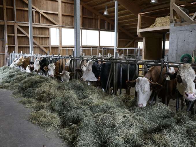 2012 hat die Familie dann in einen neuen Stall mit Melkrobotor investiert. Der alte Stall musste beim Bau jedoch gar nicht weichen, sondern wurde für die Heubelüftung und als Heulager umfunktioniert. Mit dem Kran kann man das Futter nun direkt vom alten Stall in den neuen transportieren und auf den Futtertisch abwerfen. „Der neue Stall ist für uns einfach eine enorme Arbeitserleichterung, wobei das Stallgehen einem trotz Modernisierung keinesfalls ausbleibt. Man ist einfach flexibler“, berichtet Hofübernehmer Andreas, der von der Stallplanung bis zum Umsetzen bereits stark miteinbezogen wurde. Als zweites Standbein bewirtschaften Vater und Sohn den angrenzenden Wald und das Holz wird Ofenfertig in der Region vermarktet.