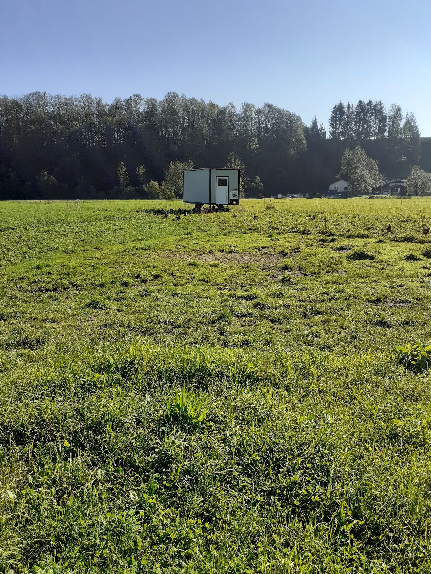 Besonders wichtig ist auch das regelmäßige Umstellen der Mobilställe. Durch die durchwegs intensive Scharrtätigkeit des Geflügels und bei längeren Regenperioden wird der Boden vor allem in Stallnähe stark in Mitleidenschaft gezogen. Hier ist ein ständiger Wechsel der Fläche, um einer Schädigung des Bodens vorzubeugen, besonders wichtig. Auch die neue, ab 01. Jänner 2022 geltende EU- Bioverordnung fordert, dass die Besatzzahlen so niedrig gehalten werden, dass Überweidung, Zertrampeln des Bodens, Erosion und Umweltbelastung verursacht durch die Tiere oder die Ausbringung des von ihnen stammenden Wirtschaftsdüngers möglichst gering gehalten werden soll. Auch eine rasche Nachsaat von kahlen Flächen mit geeigneten Nachsaatmischungen (z.B. Bio-Austria Hühner Auslauf Mischung von Samen Maier) ist sinnvoll. Das hilft auch vorbeugend gegen unerwünschte Lückenfüller im Grünland wie z.B. Ampfer.